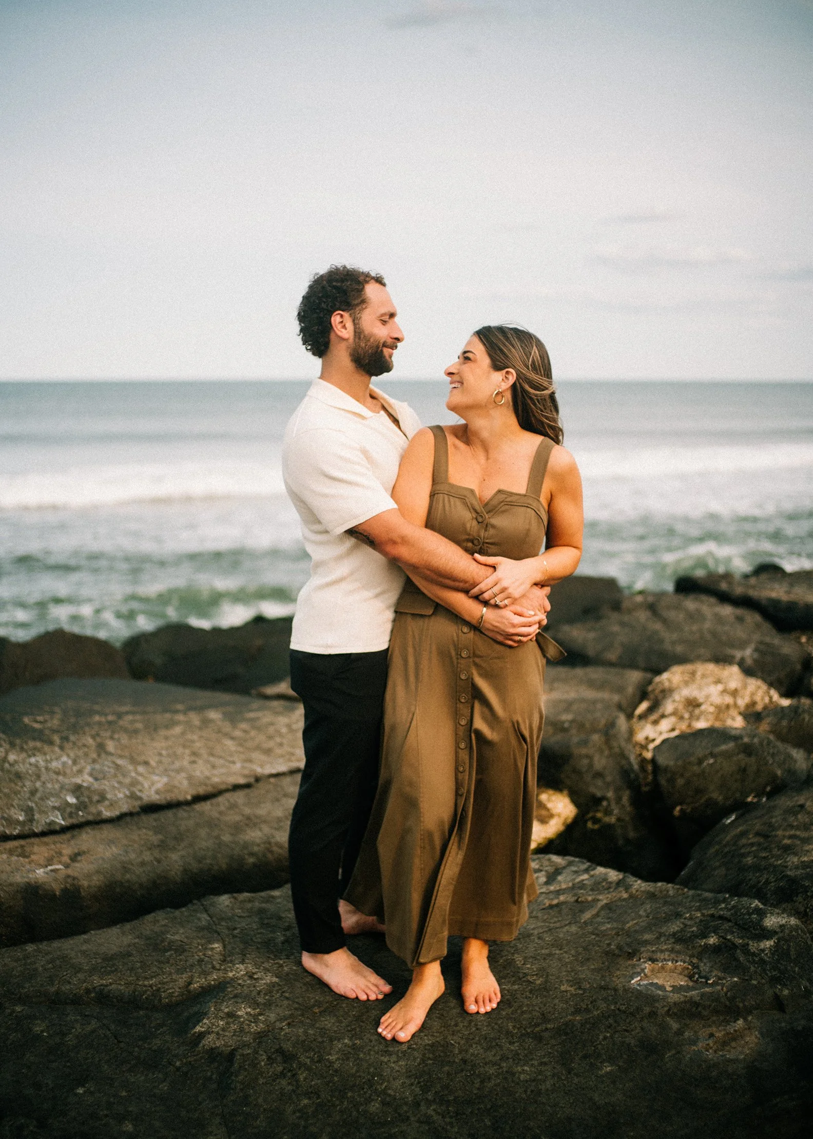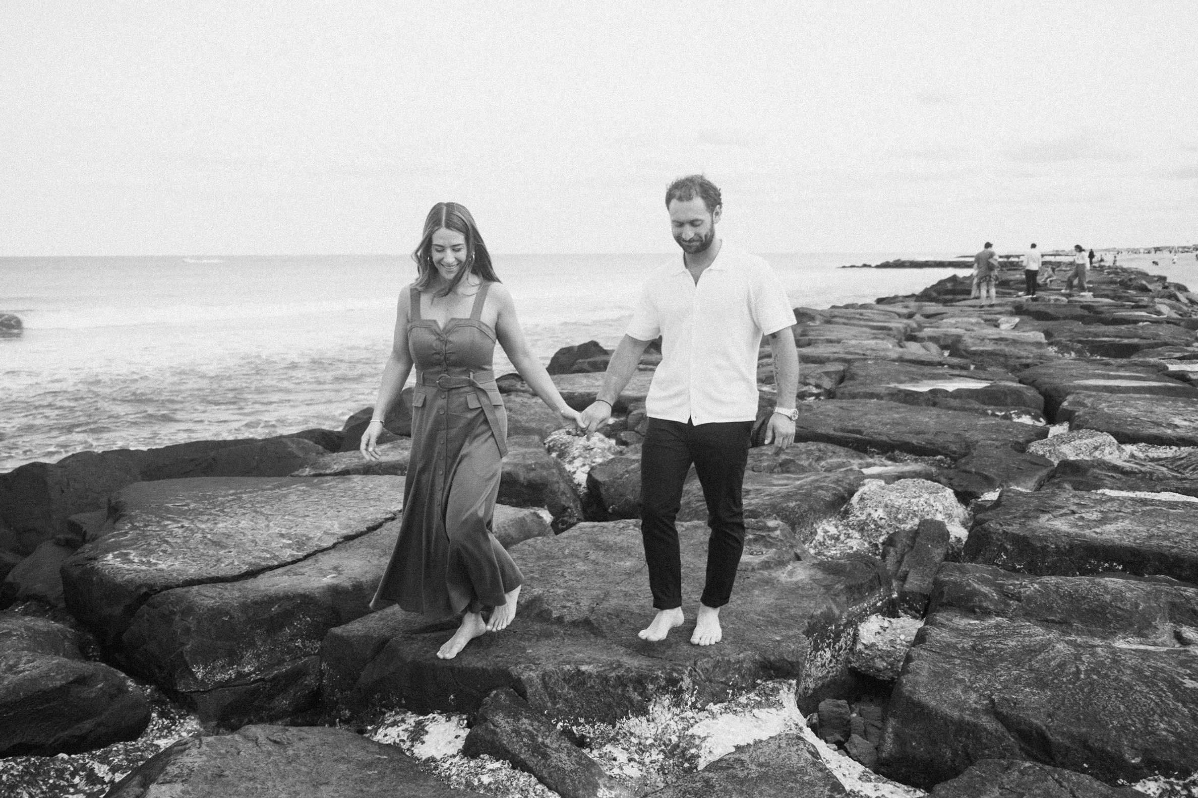 But the real magic happened when we made our way down to the jetty. The rocks there are dark and volcanic-looking, creating this dramatic contrast against the pale sand and blue-green water. At low tide, tidal pools form in the crevices, little ecosystems of their own. Alex kicked off her shoes immediately - those rocks are treacherous in heels - and Mike followed suit. There's something about being barefoot on rocks by the ocean that strips away pretense. You have to pay attention to where you're stepping, you have to hold on to each other for balance, you have to be present. The camera-shyness Alex had worried about simply evaporated. She wasn't thinking about being photographed anymore; she was just navigating the rocks with Mike, laughing when the waves came in closer than expected, settling into the rhythm of the ocean.