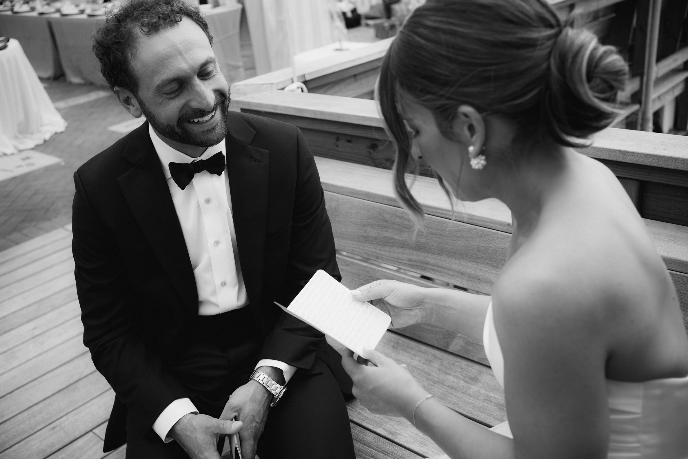 Their wedding took place at the end of September, when summer crowds have thinned but the weather is still warm and the light turns golden earlier in the afternoon. We started the day with a first look on the yacht club docks, the bay stretching endlessly behind them. The joy on their faces when they saw each other was immediate and unguarded - all the camera-shyness Alex had worried about during the engagement session had evaporated completely. Before the ceremony, they shared private vows on the deck overlooking the water, just the two of them, an intimate moment before the public celebration began.